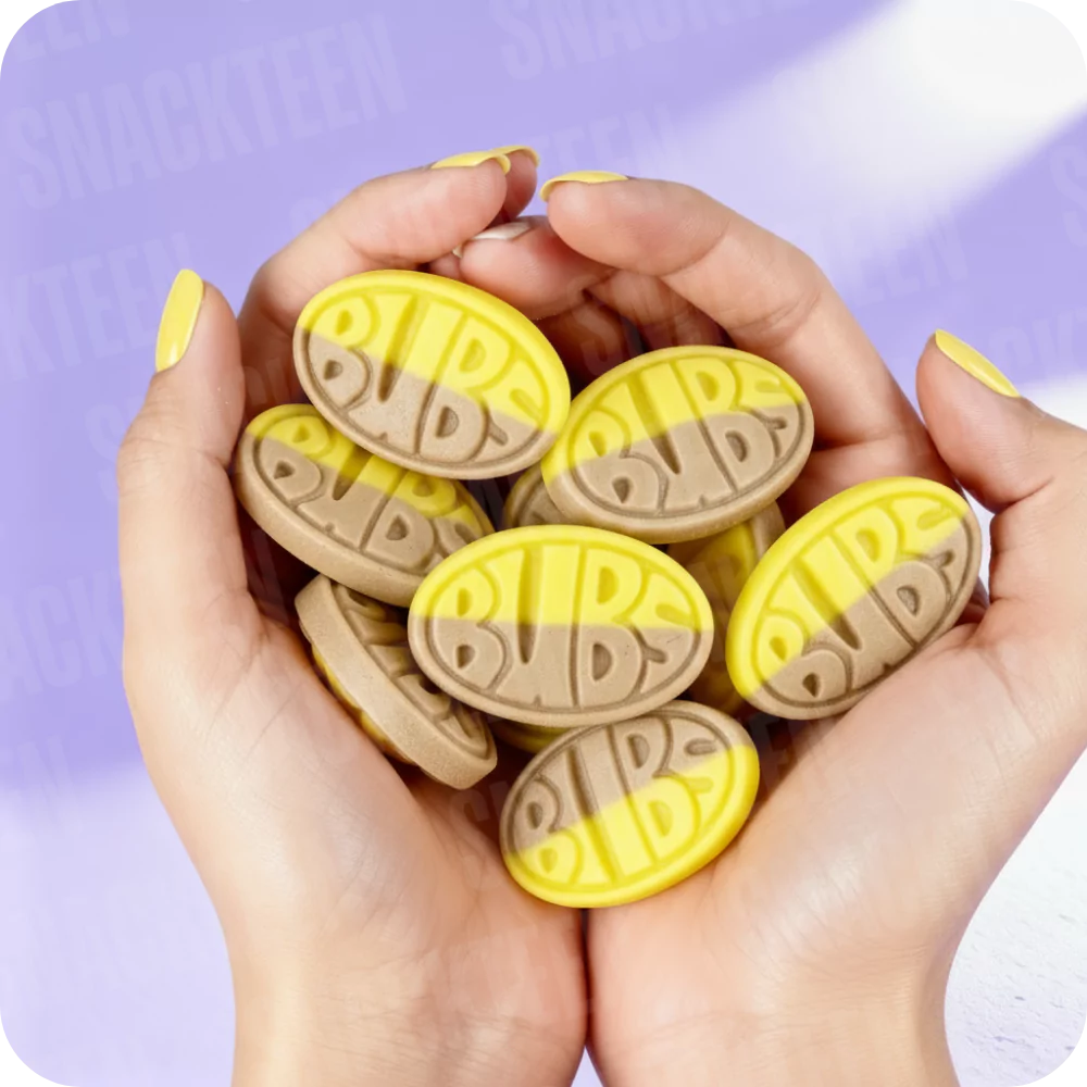 BUBS Banán és Karamell gumicukor – krémes karamell és édes banán íz vegán, puha édességben, különleges élmény minden falatban.