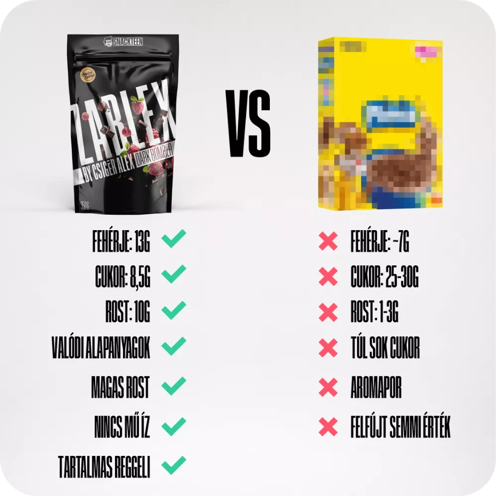 Kóstold meg a ZABLEX Dark Bomber étcsokis-málnás gabonapehely összeállítást! Intenzív ízélmény, ropogós textúra és egészséges reggeli egyben. Próbáld ki most!