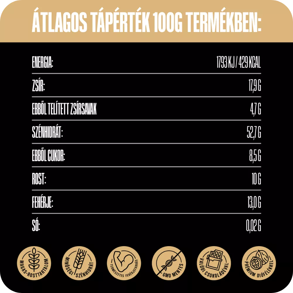 Allergének: gluténtartalmú (zab, rozs) és dióféléket (kesudió, mandula) tartalmaz. Nyomokban földimogyorót, szezámmagot, tejet és szóját is tartalmazhat.