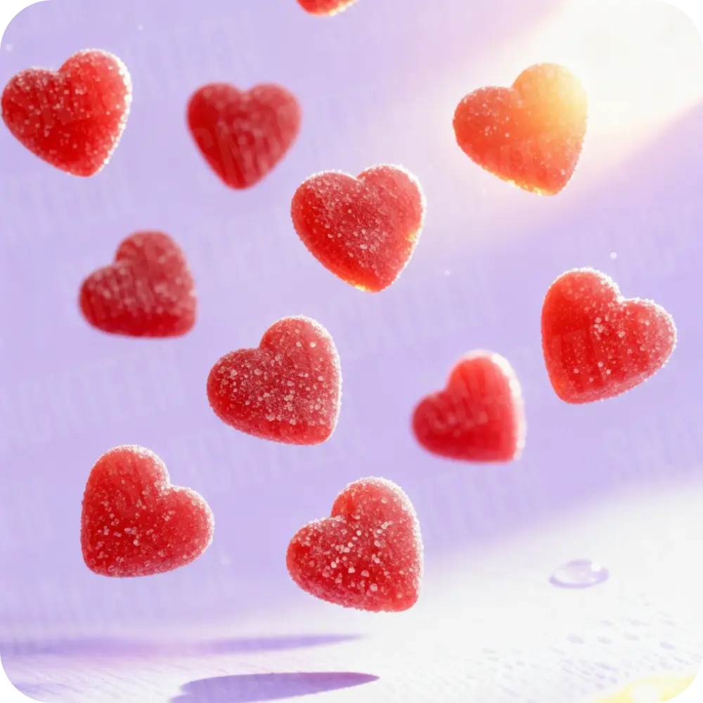 A Savanyú epres szív gumicukor szív alakú, élénkpiros édesség, gazdag eper ízzel és jellegzetes savanykás utóízzel.